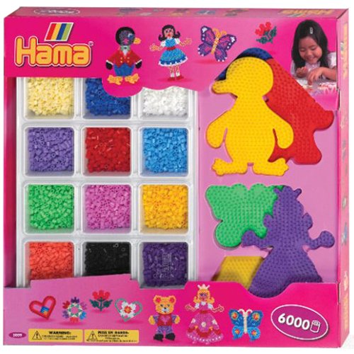 HAMA Super-Geschenkpackung. Dieses Set beinhaltet über 6.000 Perlen in in 12 verschiedenen Farben, sechs Motiv-Steckplatten in unterschiedlichen Farben sowie weiteres zahlreiches Zubehör zum Gestalteten toller Bilder. Für Kinder ab 5 Jahren.